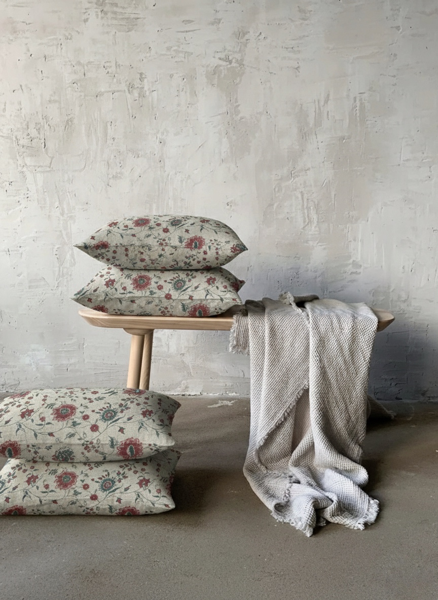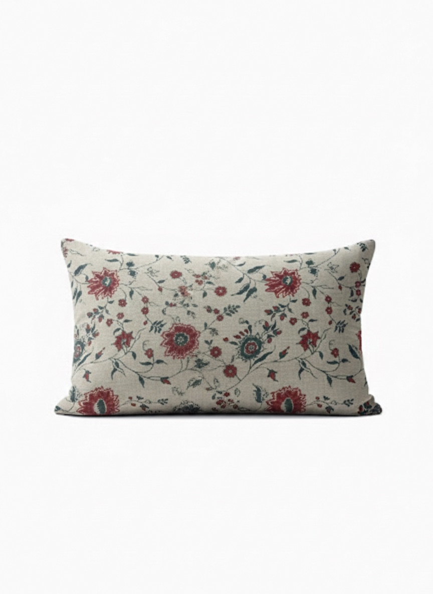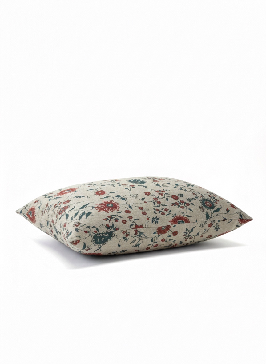 Cojín confeccionado en lino 100% ,estampado con motivo floral en tonos suaves sobre fondo natural.