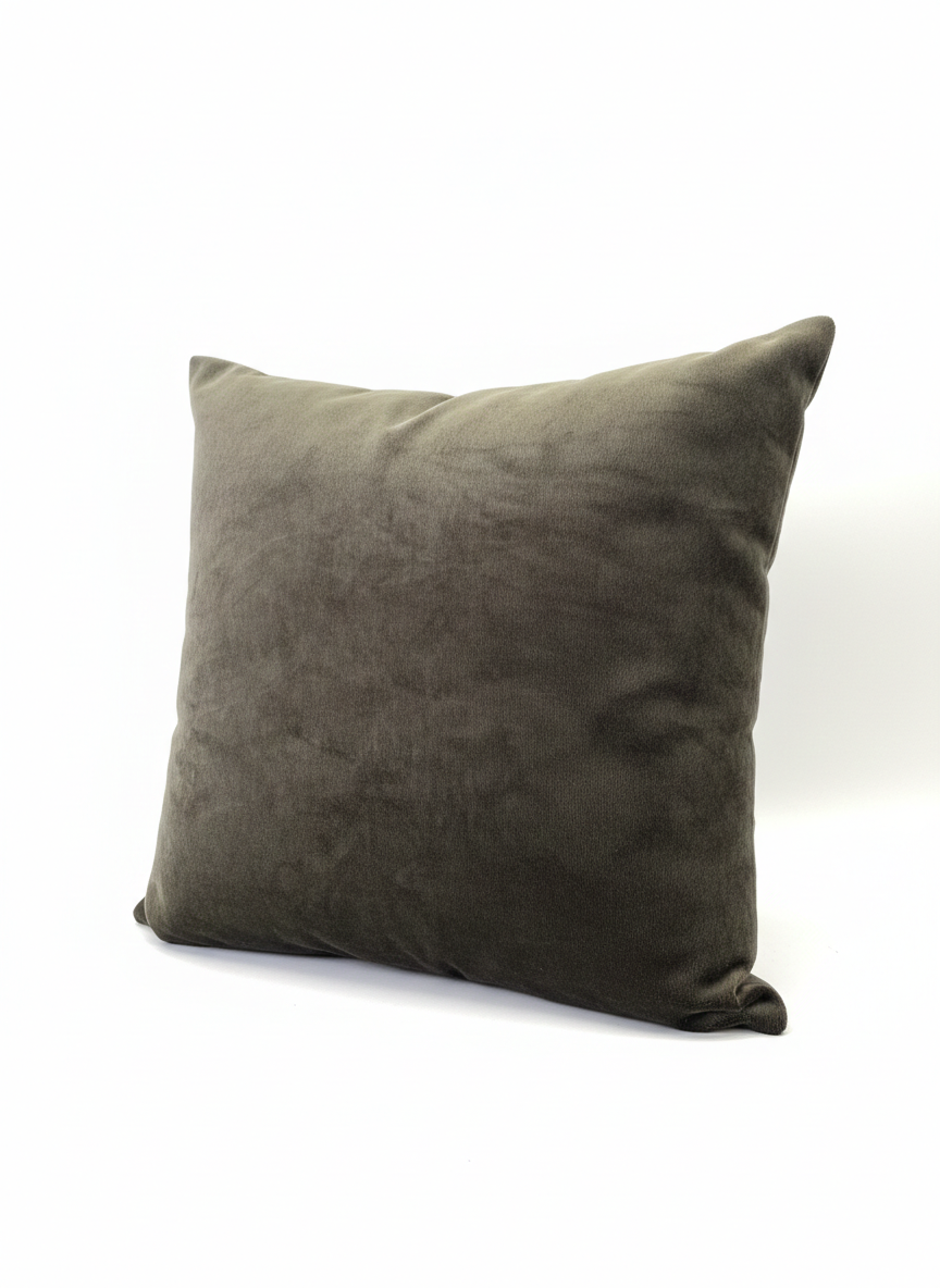 Cojín de terciopelo de alta gama en un profundo tono verde musgo. Elegancia atemporal y tacto ultra suave para salones y dormitorios sofisticados.